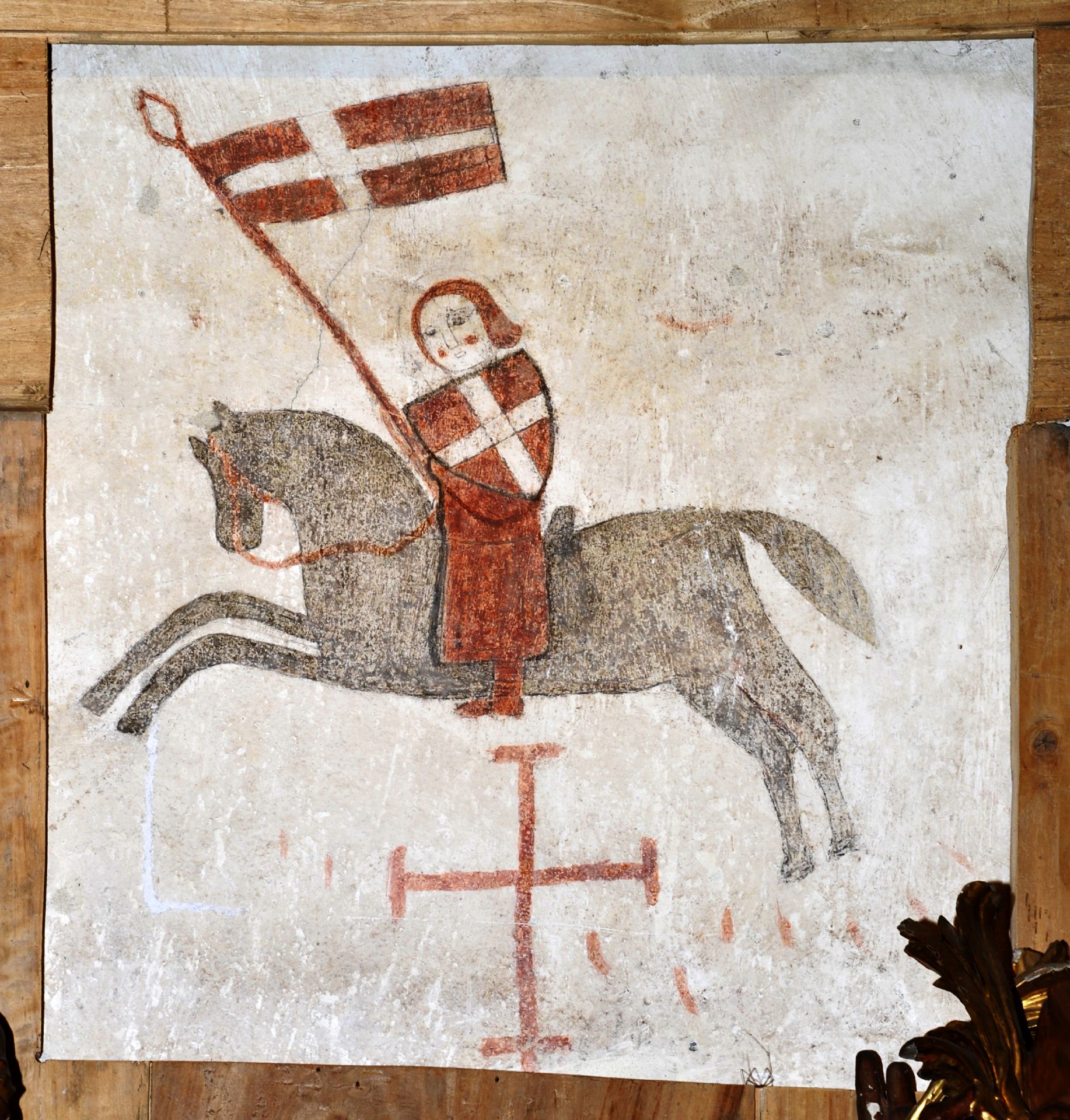 Dipinto di un cavaliere munito di scudo e vessillo con croci rinvenuto in sacrestia sulla parete meridionale. Si tratta di un probabile esercizio pittorico di un giovane allievo.