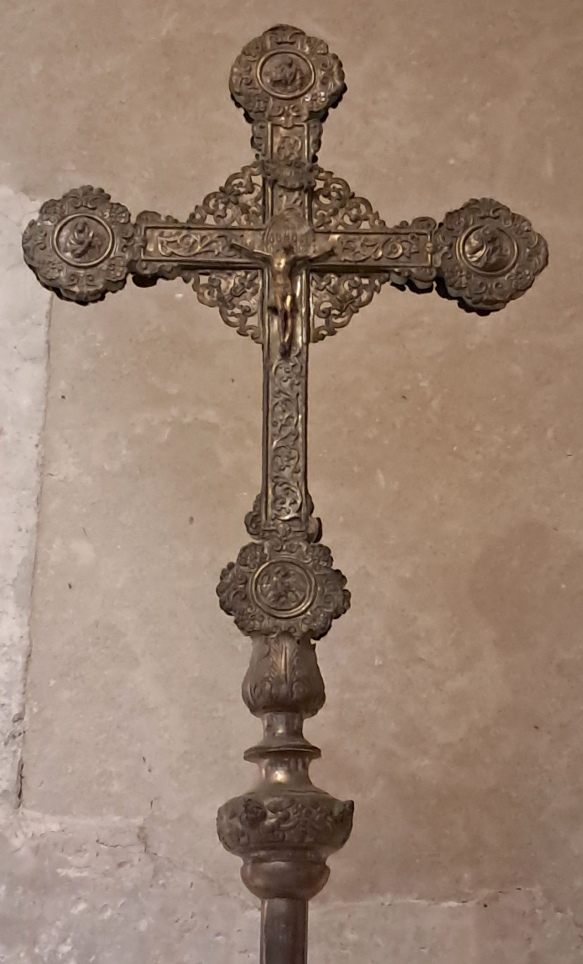 Venne eseguita da un argentiere lombardo su lamina in rame argentato, decorata a racemi e fissata ad un anima lignea. Nasce da un nodo decorato a foglie e quattro teste di cherubini. Sui tondi terminali compaiono la Vergine, Maria Maddalena, San Giovanni Evangelista ed in basso il motivo cristologico del pellicano che nutre i piccoli.